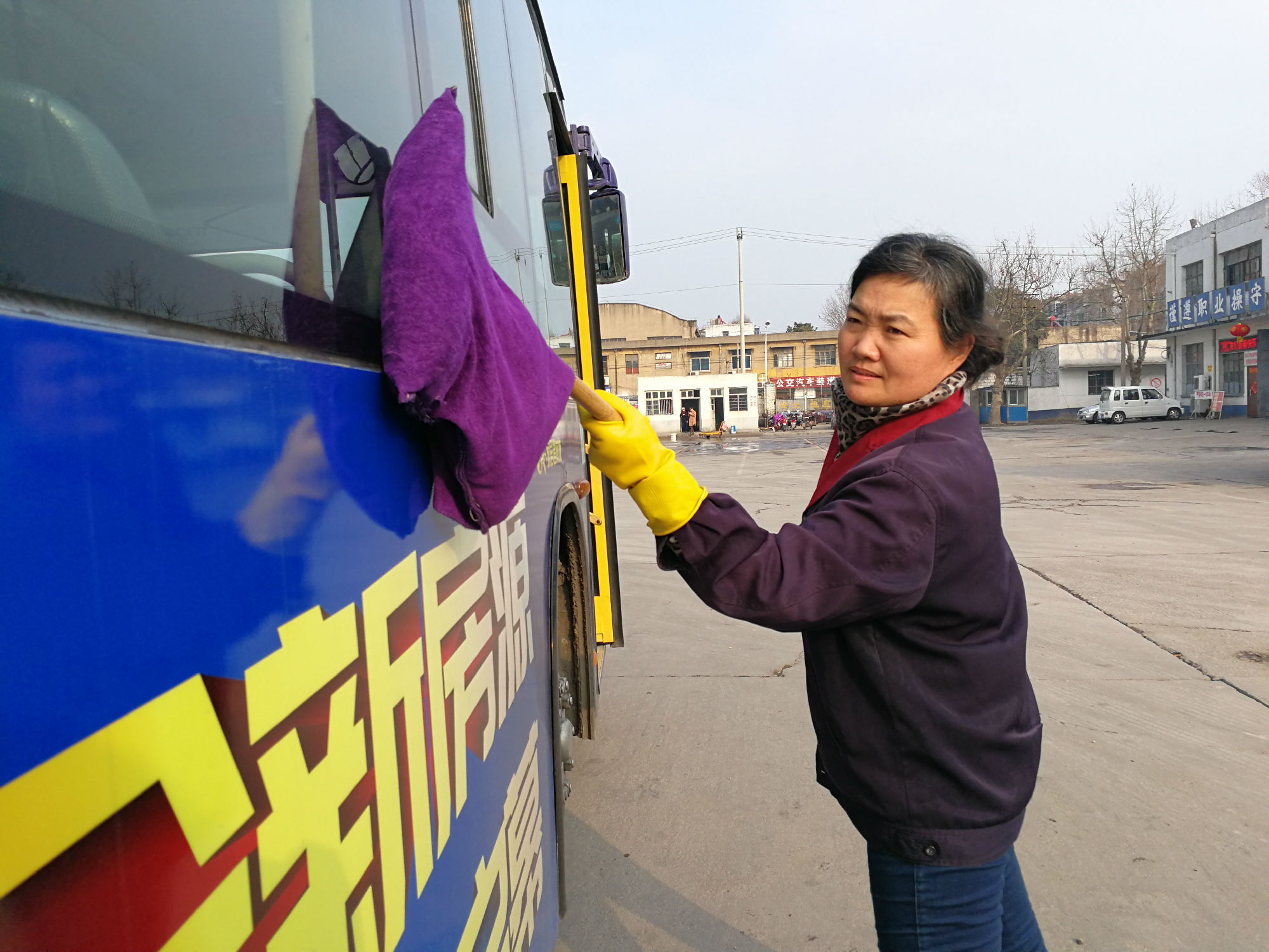 清晨5點(diǎn),74路保潔員韓黎明已經(jīng)來(lái)到韓山車場(chǎng),開(kāi)始保潔車輛。由于氣溫較低,車場(chǎng)內(nèi)的水龍頭凍壞了,無(wú)法正常使用,她只好到遠(yuǎn)一點(diǎn)的地方,將水一桶桶的運(yùn)來(lái),開(kāi)始細(xì)心地擦拭玻璃,車輛外圍,車內(nèi)座椅、內(nèi)圍板....不放過(guò)一處角落。冬天的水冰涼刺骨,清洗抹布的手凍得通紅,搓搓手、跺跺腳,她又賣力的干了起來(lái)。車窗玻璃上厚厚的霜十分難擦,加上道路上經(jīng)常遇到灑水車,跑完一圈回來(lái)車身又臟了,增加了車輛保潔難度。韓黎明不怕辛苦,任勞任怨,只要有臟的地方,她就再次清潔,確保出場(chǎng)的每輛車都干干凈凈。期間,她的衣服多次被汗水浸透,晾晾汗,又凍得發(fā)抖,韓黎明沒(méi)有抱怨,仍然堅(jiān)守完成自己的工作。